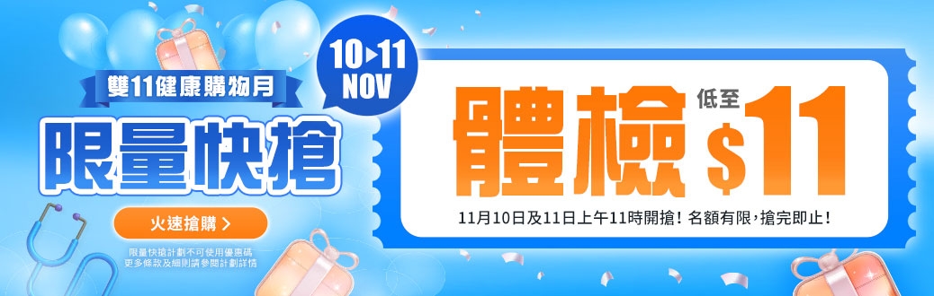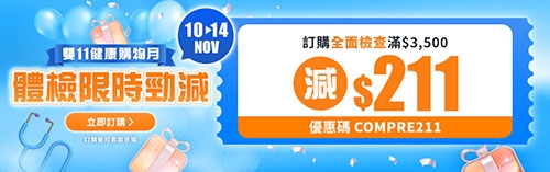 11月10-14日訂購任何全面體檢計劃滿HK$3,500,輸入優惠碼COMPRE211即減HK$211。