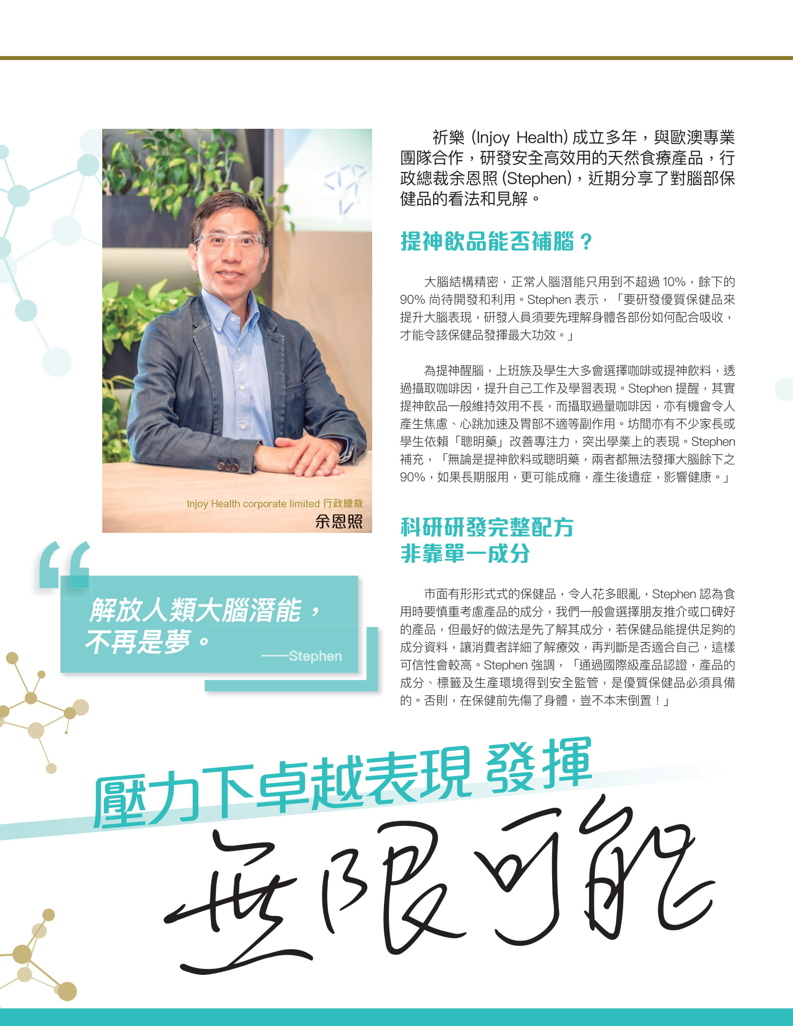一直以來,人的腦部只用了不到5%,95% 的大腦潛能尚待開拓和利用。直到20世紀,科學家用先進科技去剖析大腦的運作趨向,理解到腦部的化學傳導物能激活或抑制神經細胞,從而強化個人優勢,增強專注力,令思路更清晰 ,增加思考速度,助你成就最好的自己。